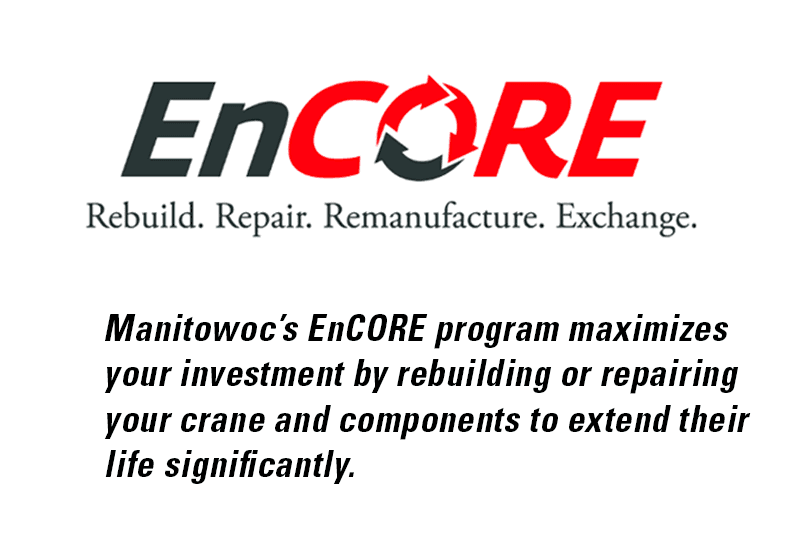 Manitowoc offers an extensive selection of remanufactured parts through the EnCORE program, which include: engines, motors, transmissions, gearboxes, hydraulic cylinders, and more. Each remanufactured part comes with a 1-year warranty.